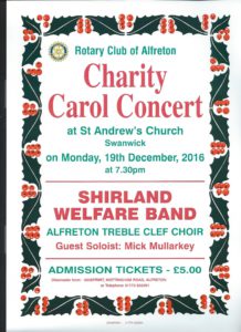 President Roger Stevenson thanked the Band, Choir, Mick Mallarkey for an enjoyable evening, the Mayor of Alfreton and the audience for attending thereby supporting Rotary Charities and wishing all present a Merry Christmas, a Happy New Year and a safe journey home.